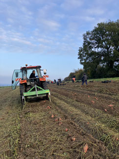 Am Wochendende wurden die Süsskartoffeln geerntet. Das Kraut wurde abgeschlegelt und die Knollen mit dem Blumenzwiebelroder aus der Erde gehoben. Danach wurden die Knollen vom Hand aus der Erde in Kisten geerntet. Nun lagern die Süsskartoffeln für etwa ein Woche in einem feuchten warmen Raum, damit kleine Verletzungen vernarben können und sie lagerfähig werden.